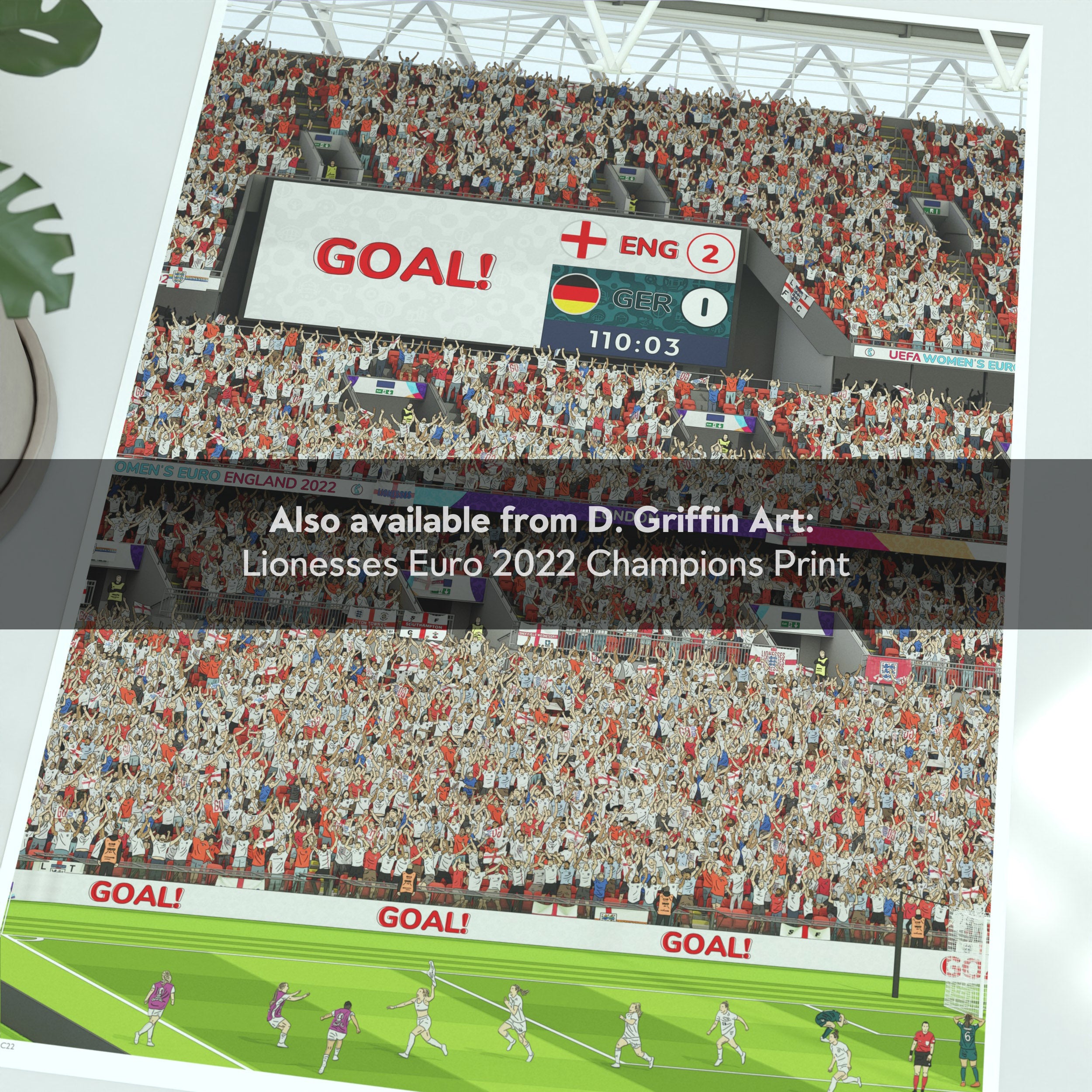 An illustration of Chloe Kelly’s celebration after scoring the decisive penalty that sealed England Women’s historic Euro 2025 victory over Spain in Basel, Switzerland on July 28th, 2025. A must-have piece for any proud Lionesses fan.